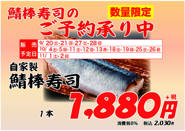 只今、鯖棒寿司のご予約を承っております。ご予約の際は、お総菜コーナーまで!
